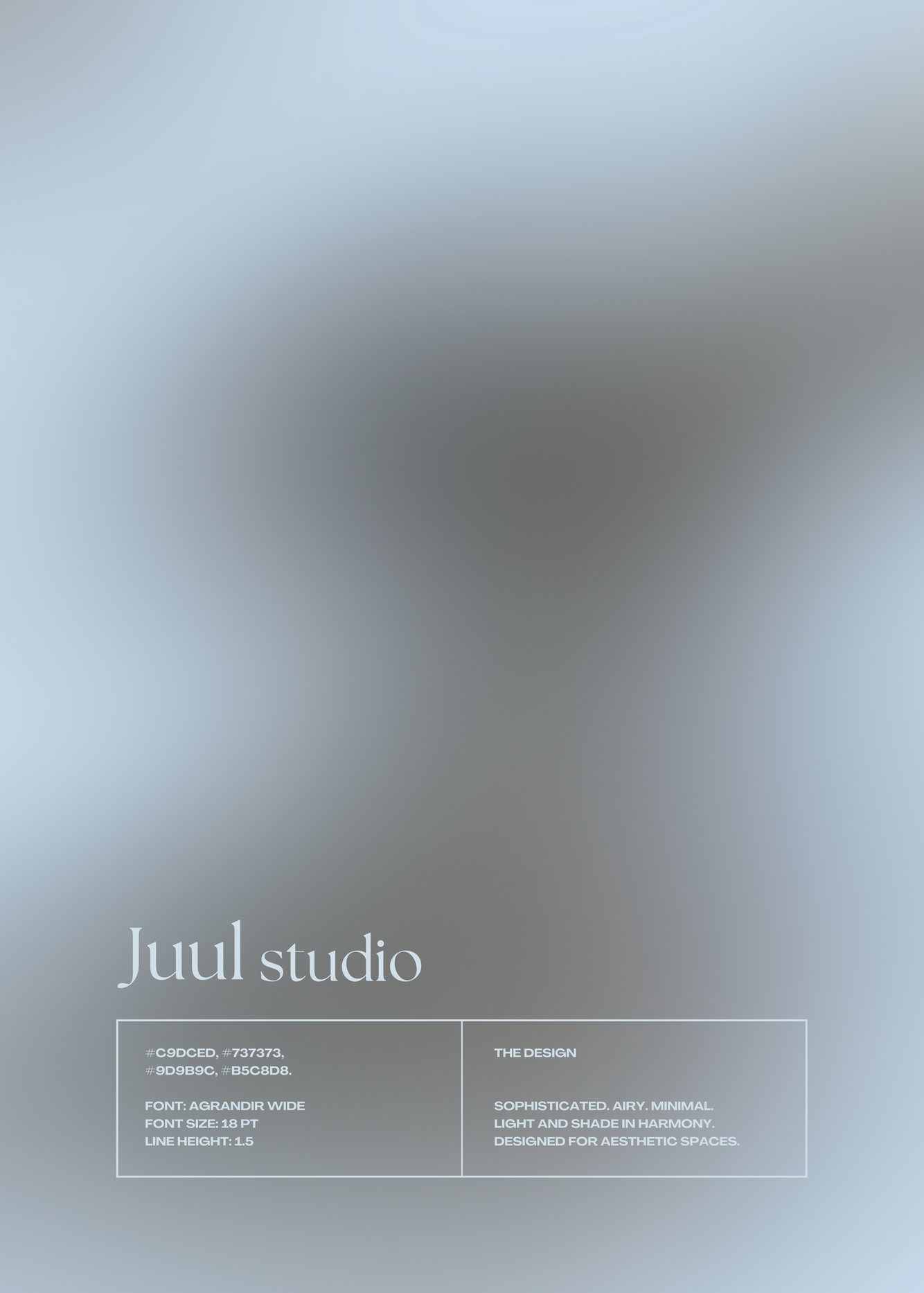 Nederst til venstre viser de dominerende farver og skrifttyper, mens højre side indeholder ord og beskrivelser, der giver et indblik i de tanker og ideer, der ligger bag designet. Perfekt til dig, der er passioneret omkring kunst og design, og som værdsætter noget unikt.